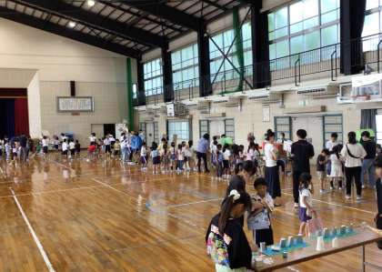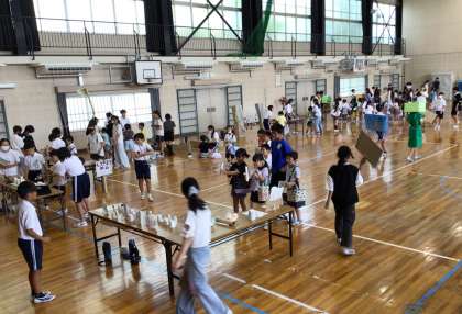 6年生が企画し、1年生を招いて夏祭りを行いました。まと当てや釣り、モグラたたきのようなゲームなど、アイディアいっぱいの屋台が並びました。
