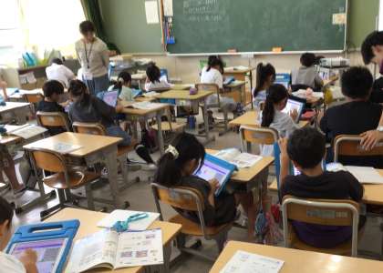 「プログラミング的思考」を育むために、プログラミング教育が実施されています。この日は、ICT支援員を迎え、3年生で、経路を考えて自動車を画面上のコースで走らせるプログラムづくりに挑みました。