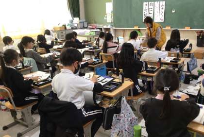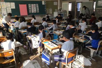 学校では、毛筆の学習が3年生から始まっています。このたび、豊田書道連盟にご協力いただき、講師を迎えて練習を行いました。姿勢や筆の扱い、文字のバランスなど、基本を大切にすることを改めて学びました。