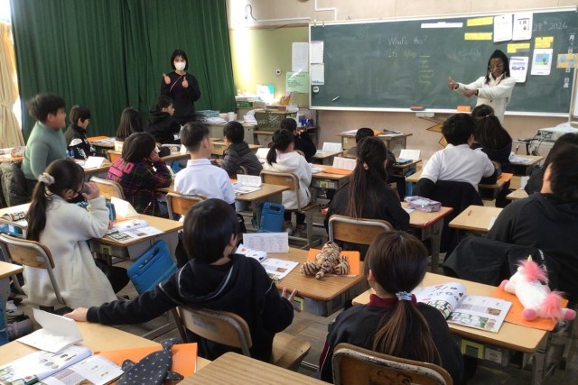 外来語とそれが由来する英語の違いに気付き、身の回りの物の言い方や、ある物が何かを尋ねたり答えたりする表現に親しむ学習に取り組んでいます。この日は、クイズやゲームでorangeやgreen pepperなどの名前に親しみました。