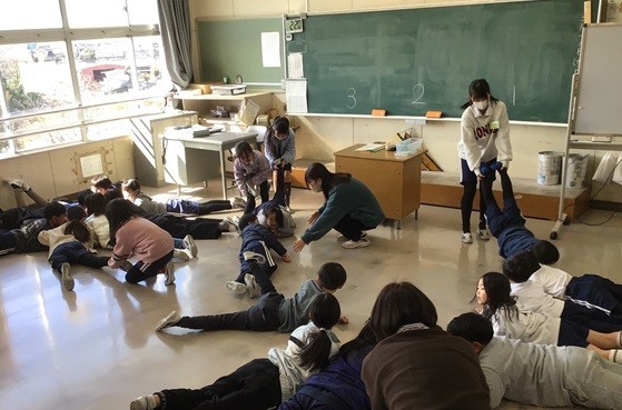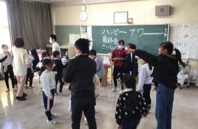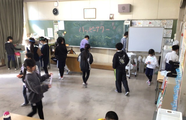 2時間目の後の長い休み時間に、6年生の企画・運営で、異なる学年と交流をするハッピーアワーを開催しました。椅子取りゲーム、大根抜き、宝探し、猛獣狩りゲームなどで楽しみました。今回が今年度の最終回で、「5年生がんばれ」という6年生からのメッセージも見られました。