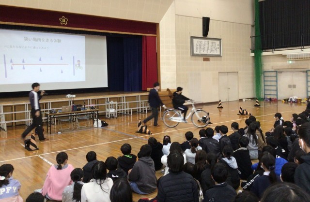 自動車学校・豊田市役所高岡支所のご協力で、交通安全教室を開きました。信号の色が表す意味、自転車は車道の左側を通ること、重い荷物を前かごに入れるとハンドルを取られる危険があることなどを学びました。