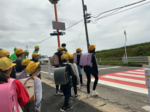 第1回の通学団会が行われ、登下校中のルールについて確認しました。また、前林中学校の南西に新しく横断歩道と「ピカッとわたるくん」が設置され、隅田方面へ帰る子どもたちが渡り初めをしました。