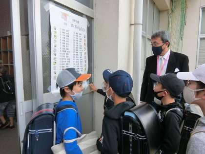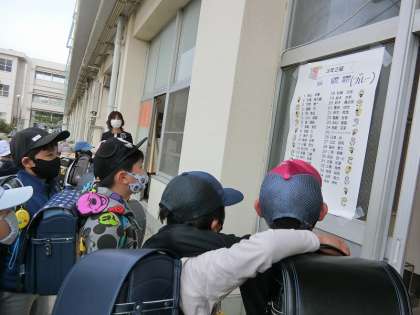 昇降口に掲示された名簿を見て新しいクラスを確認しました。友達とクラスを聞き合い,新しいクラスにわくわくの瞬間です。