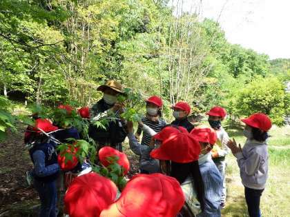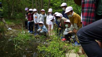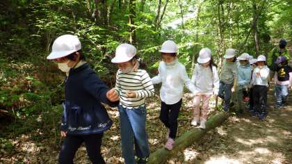 生活科の学習「春のあそび見つけた」で,トヨタの森へ出かけました。みんなで虫を発見したり,草花のにおいを楽しんだり,おたまじゃくしを手ですくったりしました。山の中を思いっきり駆けまわり,楽しい時間を過ごしました。