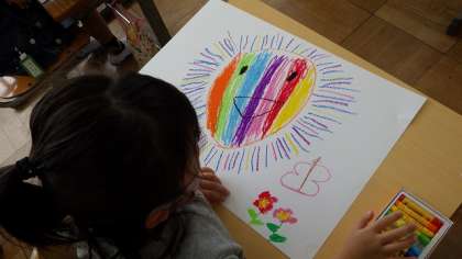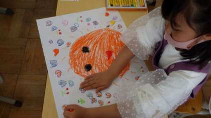 図工の授業では,色も形も自分で考えたオリジナルの太陽を描きました。カラフルでにっこりわらっている太陽を描きたいな,太陽の周りに雲や虹を加えて楽しそうな絵にしたいなと一生懸命考えて取り組みました。個性あふれる自分だけのとても素敵な太陽が完成しました。