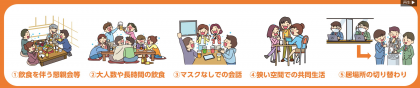 ・「3密」と「大声」の回避、こまめな手洗い、咳エチケットを徹底する。