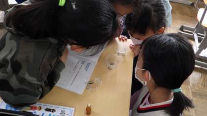 理科では,インゲンマメを育てることにより,発芽や成長に必要な条件を学習しています。ヨウ素液を使って,種子に養分があるかについても確かめました。青むらさき色に変化していく様子を興味深そうに観察していました。