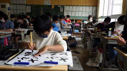 書写では,「ふるさと」の文字を清書しました。休み時間の間にしっかりと用具の準備をし,点画のつながりを意識して取り組むことができました。