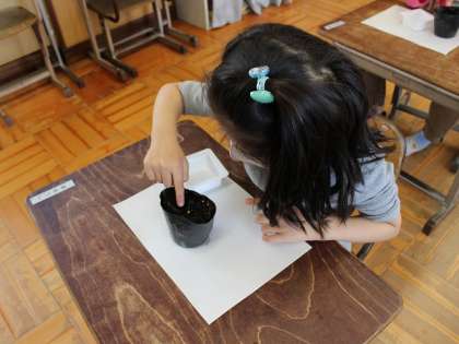総合的な学習の時間や生活科の時間では,ケナフとサツマイモを育てていきます。まずはケナフの種を観察して,ポットに植えます。人差し指の第一関節まで掘った穴に種を植え,優しく土をかぶせます。みんな大切に種を植えていました。