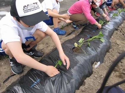 サツマイモの苗の植え方は,うねに沿って水平に,寝かせるようにさしていきます。葉の付け根あたりから新しい根が生えるためです。一見すると「倒してさしても大丈夫なの?」と思いますね。子どもたちは興味津々で植え方を学んでいました。その後,すぐに外に出て,学んだことを思い出しながら植えていきました。「早く大きくなってほしいね。」という声が聞こえ,成長を楽しみにしているようです。これからしっかり世話をしていきます。