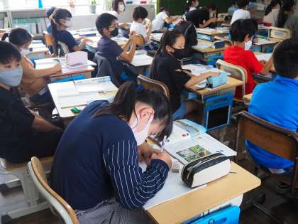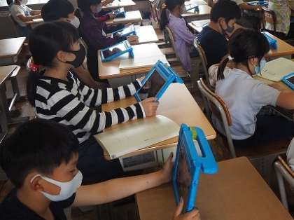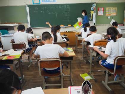 4年生の教室をのぞいてみると,どのクラスも意欲的に学習をしていました。1組では,算数の授業を少人数で行っていました。クラスの人数が半分になると質問もしやすかったり,授業がよく分かったりします。2組では,理科の授業で4月から変化した自然のものはあるか考えていました。3組では,オンライン朝の会のための練習をしていました。雨の日が続いていますが,どの子もがんばって学習に取り組んでいました。