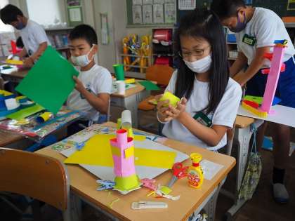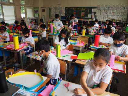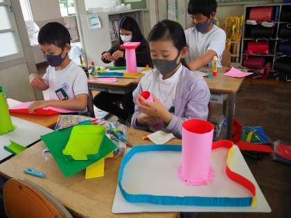 図画工作科の授業では,「コロコロガーレ」という作品に取り組んでいます。ビー玉の転がり方を想像して,紙をトンネルのようにしたり,ビー玉が外に転がらないように柵を作ったりしました。どんな作品になるのか楽しみです。紙コップや洗濯ばさみなど,家庭でのご準備ありがとうございました。