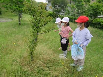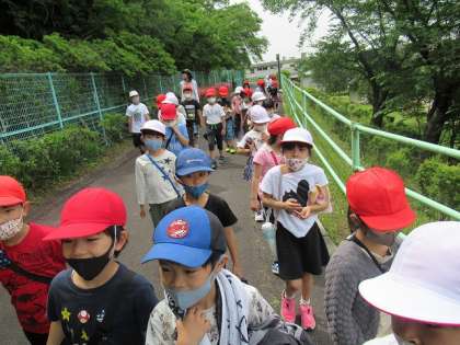 生活科の授業で、学校のまわりを探検しました。公園,交流館,子ども園などたくさんの施設の横を通ります。環状線の電車も見ることができました。梅の木公園に着くと、梅の実を見つけたり、虫とりをしたりして楽しみました。学校のまわりにある素敵なものを,たくさん発見することができました。