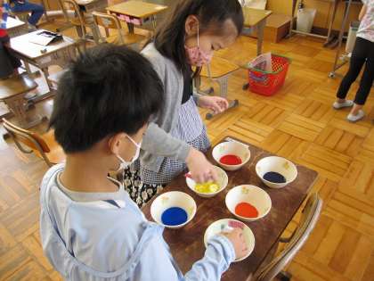 「赤と青を混ぜると何色になるでしょう」と声をかけて絵の具で作った色水を混ぜると、子どもたちは、真剣な表情で変化を見守ります。「あっ。グレープジュース」という声も聞こえてきます。鮮やかな紫色,確かに飲んだらおいしそうです。今回の図画工作では、このできあがった色水を使って、「染物屋になろう」という活動をしました。