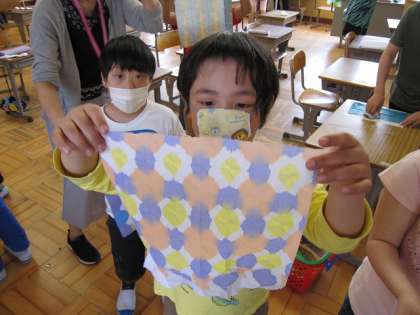 和紙を四角や三角に折りたたみ、出来上がった角に色水を染み込ませました。白い部分が残っても、染めた色が重なっても素敵です。様々な色や模様ができあがり、とても面白い作品が出そろいました。