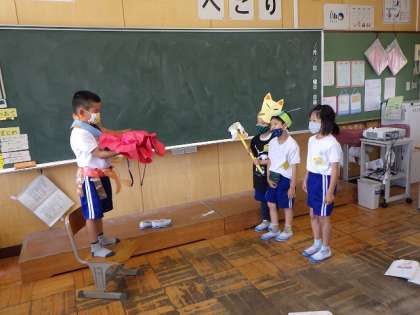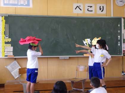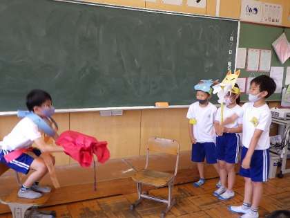 国語「名前を見てちょうだい」の学習で,登場人物の様子を,声や動きで表現しました。友達と役割を決めて,さぁスタート!えっちゃんやきつね,牛,大男になりきって,名演技を繰り広げました。