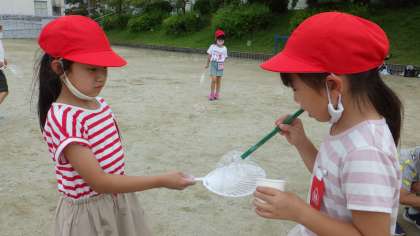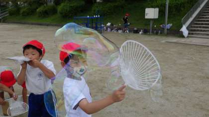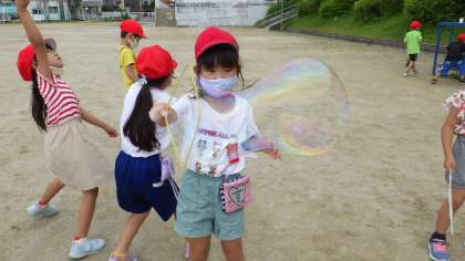 「うちわを使うと大きなシャボン玉がたくさんできるよ」「ストローだと,小さなシャボン玉になるね」「ハンガーを使った時が,一番大きなシャボン玉ができたよ」など,楽しむだけでなく,学びも多い素敵な時間を過ごすことができました。