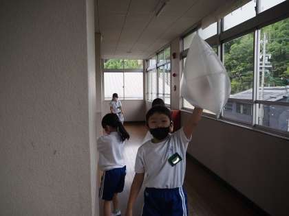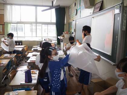 理科の学習では、「とじこめた空気」という単元で学習を進めています。空気を触ってみるには、ビニール袋が必要だ!という子どもたちの考えで、ビニール袋に空気を入れてみました。「袋を押してみると固かったよ」や「走るとたくさん空気が入ったよ」など、たくさんの気付きがありました。
