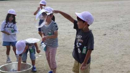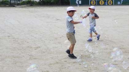 ハンガーやうちわ,ストローなど自分で考えて用意した様々な道具で楽しく活動できました。自分の顔より大きなシャボン玉や,体の周りにたくさんできるシャボン玉に大喜び。子どもたちの笑顔があふれていました。