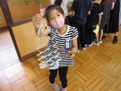 7月7日は七夕ですね。図工の学習では、「たなばたかざりをつくろう。」と題して、みんなで,いろいろな飾りを作りました。お手本を見ると、色紙が網のようになっていたり、提灯のようになっていたり。どうやったら、こんな形になるのでしょう?早速みんなでやってみます。紙を折りたたんで、はさみで切り込み、開いてみると・・・。「できたよ。見て!」