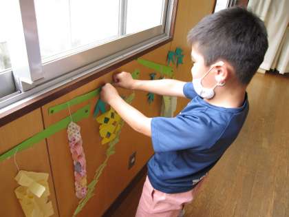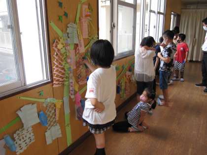 できあがった飾りと一緒に、お願い事を書いた短冊もつるしました。みんなの作品がそろうと、とてもきれいで、七夕らしさがでましたね。