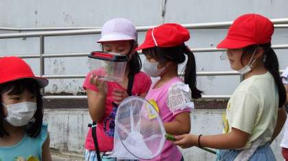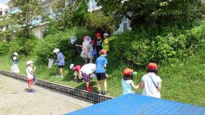 7月7日に計画していた「生き物ゲット大作戦」が雨で延期になり、子どもたちはとてもがっかりしていました。天気予報はずっと雨マーク。いつ行えるのか心配していましたが、子どもたちの願いが通じ、晴れ間も見えた9日の午前中に「生き物ゲット大作戦」を決行しました。