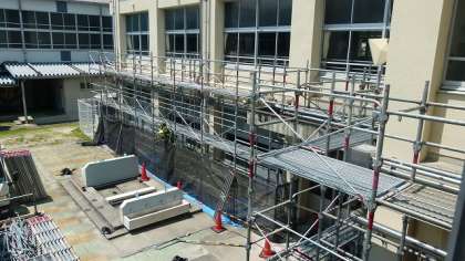 2棟南側外の様子です。4年生の昇降口前にも足場が組まれ始めました。