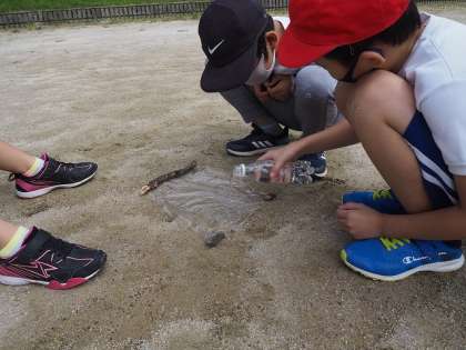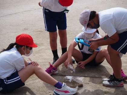 理科の授業では、校庭にあった雨水がどこへ行ったか予想をしました。「流れていったと思う」や「水が集まると水たまりになるのかな」などの予想をもとに、班ごとに校庭にラップを引き、ペットボトルで水を流して、水の流れを観察しました。タブレットで動画を撮ることで、後から見返すことができ便利です。