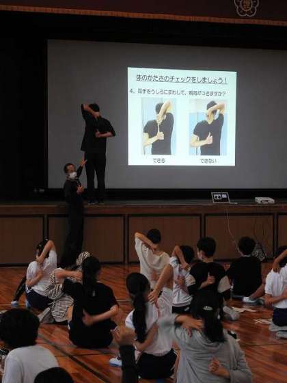 また、6年生が参加した3時間目の学校保健委員会では「よい姿勢は健康のもと?〜健やかな成長を目指して〜」をテーマに吉田整形外科リハビリテーション科の中宿先生の講演を伺いました。