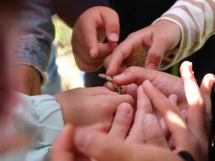みんなで「やっほー!」と叫び,やまびこが聞こえるか耳をすましました。また,生き物をドキドキしながら触ったり,葉を太陽にかざして何色に変身するのか予想し合ったりしました。