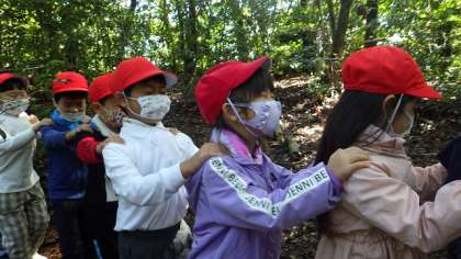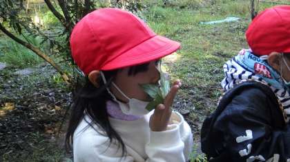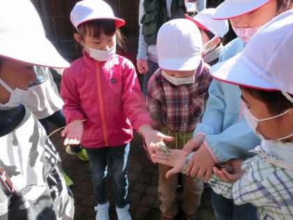 待ちに待ったトヨタの森。子どもたちは,初めての校外学習にわくわくしがなら出掛けました。トヨタの森では,ワンダーパワー(五感と心)を使って,たくさんのことを見つけたり感じたりしました。虫やカエルを触り,葉っぱの香りを嗅ぎ,森の中で目をつぶって歩き,体全体で自然を感じることができました。生き物が怖いと言っていた子が,恐る恐るトカゲに触れることができ,嬉しそうにしていた姿が印象的でした。とても素敵な時間を過ごすことができました。