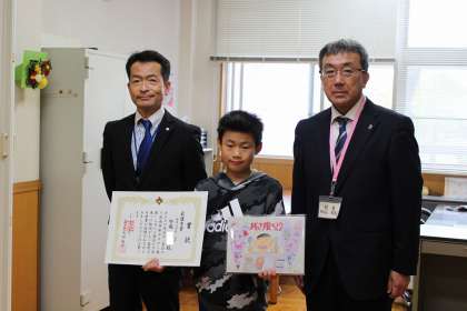 5年生 加藤さんの作品が,令和3年度食品ロス削減啓発ポスターの最優秀賞に選ばれました。おめでとうございます。豊田市役所環境部長が来校し,表彰を受けました。