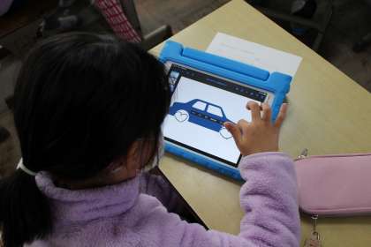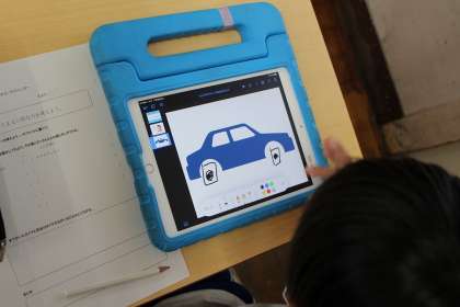 3年生は、算数で円についての学習を始めています。今日は、タイヤはどうして丸い形なのかを考えました。タブレットを使い、自分で考えて書き込んだタイヤをアニメーションで回してみます。四角やハート型だとガタガタして乗りにくそうです。円だとどんなところが良いのかな。