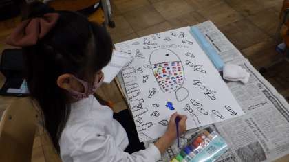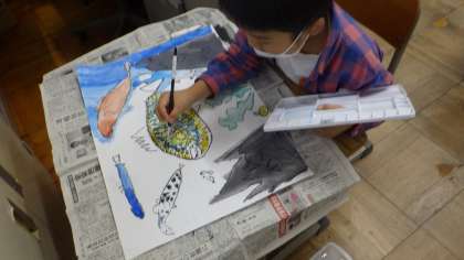 図工の学習では,「にじいろのさかな」という絵本を読んで,読書感想画に取り組みました。きらきらうろこってどんな形かな,どんな色の魚なんだろうと子どもたちが想像を膨らませ,個性豊かな「にじいろのさかな」を表現しました。はじめての読書感想画,絵の具でうろこを一枚一枚丁寧にぬり,一生懸命描きあげました。