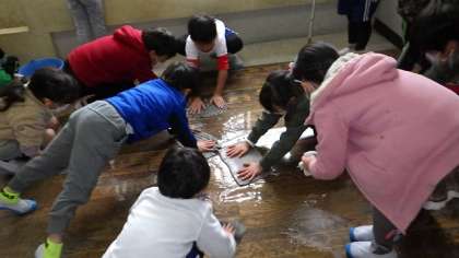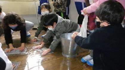 みんなの力で,あっという間に廊下の水はなくなりました。拭いてくれていた子も,水をこぼしてしまった子も,そこにいた全員がとても嬉しそうな顔になりました。梅坪小学校の子どもたちの優しさに触れることができ,とても幸せな気持ちになりました!