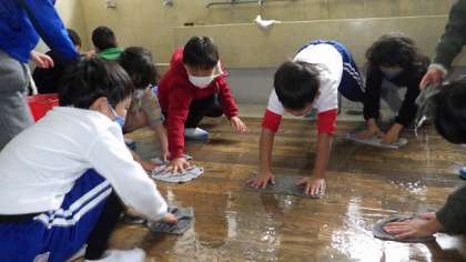 すると,近くで掃除をしていた子,目の前の1組の下雑巾係の子,通りすがりの子,お手伝いに来てくれている6年生,たくさんの子が進んで雑巾で水を拭いてくれました。誰一人,いやなことを言う子はいませんでした。