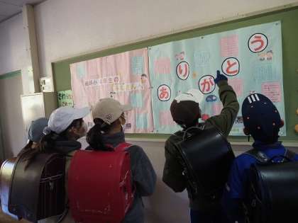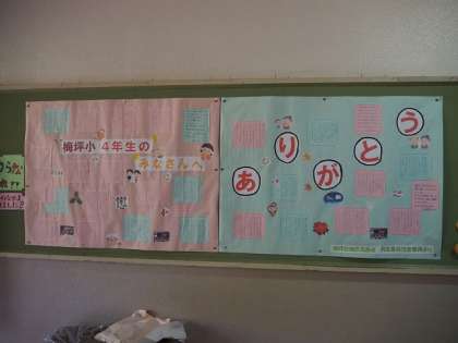 4年生の総合的な学習の時間では、「福祉」をテーマに学習を進めています。授業の一環として、地域の高齢者の方たちに手紙や折り紙をプレゼントとして作り、交流をしています。交流している高齢者の方たちからのメッセージをまとめたものを民生委員の方に届けていただきました。子どもたちは「返事がもらえるとうれしい」「手紙がちゃんと届いて読んでくれてたんだ」と、熱心にお礼のメッセージを読んでいました。