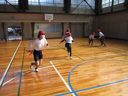 早速タグ取りゲームを始めてみると、低学年のグループは何回やっても、いつの間にか全員が時計回りにぐるぐる回り始めてしまいます。高学年グループはエキサイト。「よし、取った。タグ!」と言っている自分のタグも同時に取られていました。