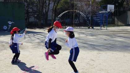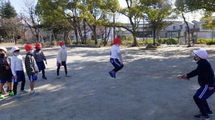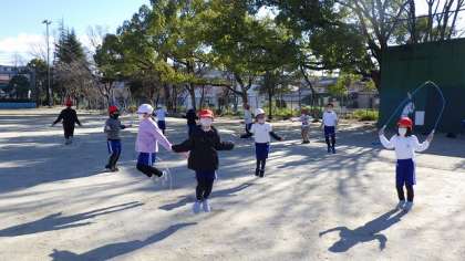 1月に行う予定の縄跳び集会に向けて大縄跳びの練習も始めました。縄に入るタイミングや連続跳びができるように友だち同士でアドバイスし合っています。