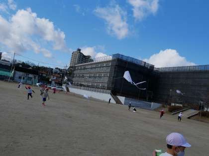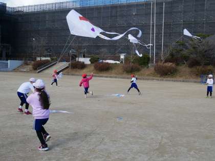 完成したたこをあげると「わー!たこがあがったよ」「高くとぶかな」とキラキラした目で,たこあげを楽しみました。