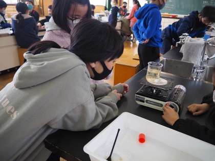 理科の学習では、もののあたたまり方について学んでいます。今回は水です。水にかつお節を入れて火にかけ、その動きを観察しました。かつお節は下から上の方に動いていき、水のあたたまる様子がよく分かりました。