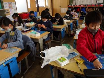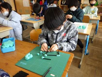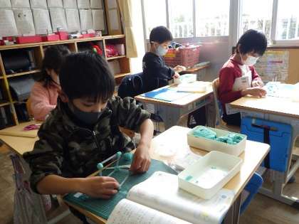 算数「はこの形」の学習では,はこを自分で作って面や辺の数を学んでいます。今日は,ひごやストローを使って作ってみました。「ちょう点が8つあるよ」「同じ長さのひごを12本使うと,サイコロみたいな形ができるんだ」など,子どもたちは多くの発見をしたようです。箱やひごの用意など,ご協力ありがとうございました。