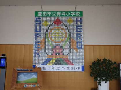 ペットボトルキャップ実行委員の子どもたちが制作したペットボトルキャップアートが完成し,玄関に飾ってあります。小学校へお越しの際は,ぜひ,ご覧ください。