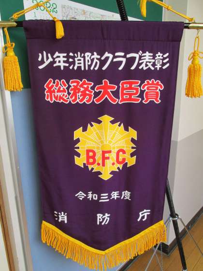 令和2年度は消防庁長官賞をいただき、昨年度に引き続き令和3年度は、総務大臣賞の受賞です。代表として、6年生の学年集会の場で披露しました。栄えある活動として令和4年度においても継続していく予定です。