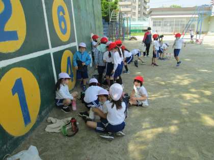 暑くなってきました。体育の時間の合間には、給水時間を設けて水分補給をするようにしています。
