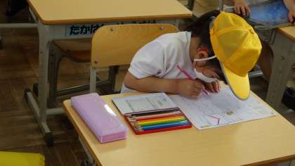 また、ひらがなの練習も始まっています。良い姿勢でお手本通りに書けるように、書き順や文字バランスにも気をつけるようにしています。ご家庭でも返却されるプリント等をご覧いただけると幸いです。