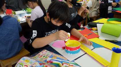 図画工作科の学習で「コロコロガーレ」に取り組み始めました。画用紙を切ったり曲げたりしながら、ビー玉が上手に転がるように工夫して制作しています。完成が楽しみです。