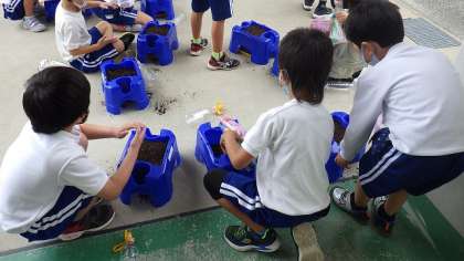 子どもたちはアサガオを育てることをとても楽しみにしており,早く種を植えたくてたまらない様子でした。今後,水やりをしながら観察を続けていきますので,お家でもぜひ話題にしていただけると嬉しいです。