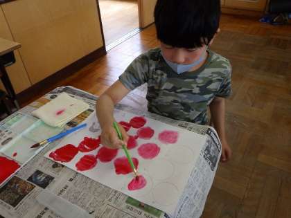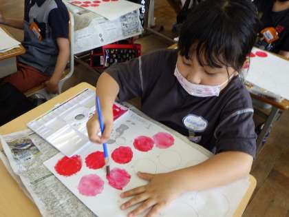 図工の時間に、絵の具と水だけでグラデーションの色の作り方を学びました。水の混ぜ方を知り、だんだん色が淡くなっていく様子に子どもたちはびっくりしていました。色を塗り終えると、「赤色だったのに、いつの間にかピンクになっていた」「水の力ってすごい!」「水だけで変化した!」と素敵な気づきをする子がたくさんいました。